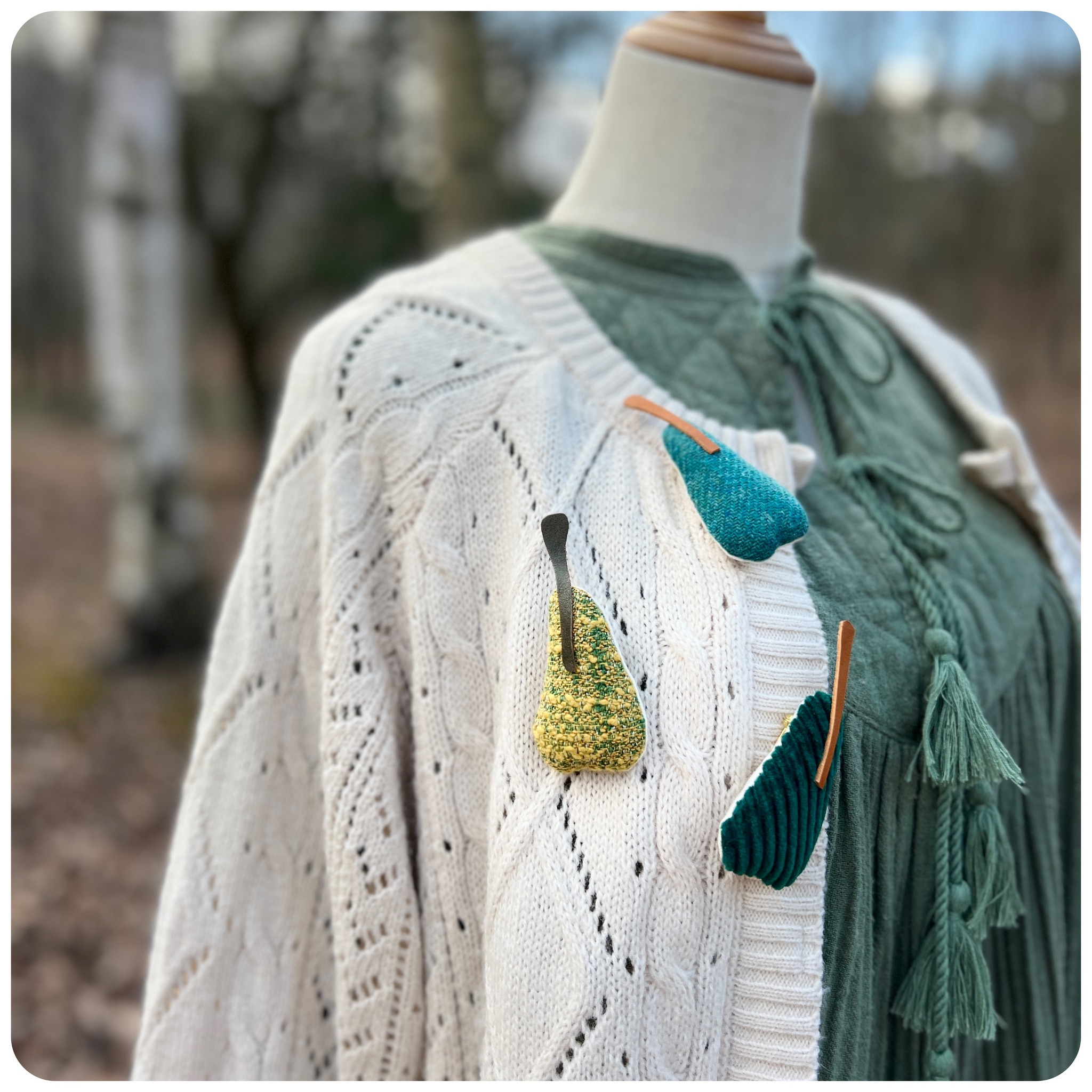 手のひらサイズのブローチ類から身につけられるポーチやバッグくらいの小さなものが多いので、今までは主に室内で作品だけを置いて撮影したものや、ハンガーに掛けた服にブローチをつけてドアの前で撮影したり。。