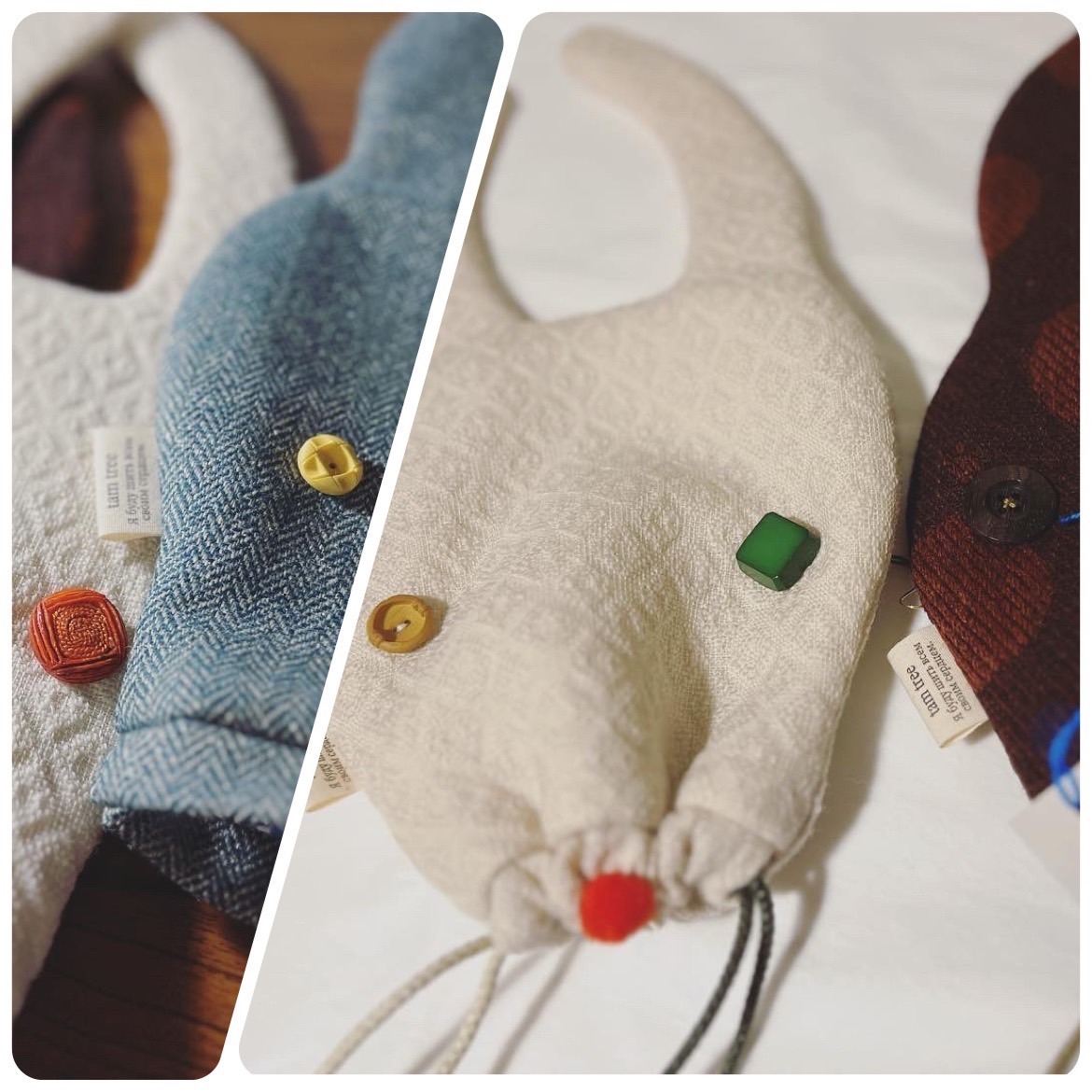 巾着の紐がうさぎの髭になっているデザインなので、使用中はお顔の上下がひっくり返ります。